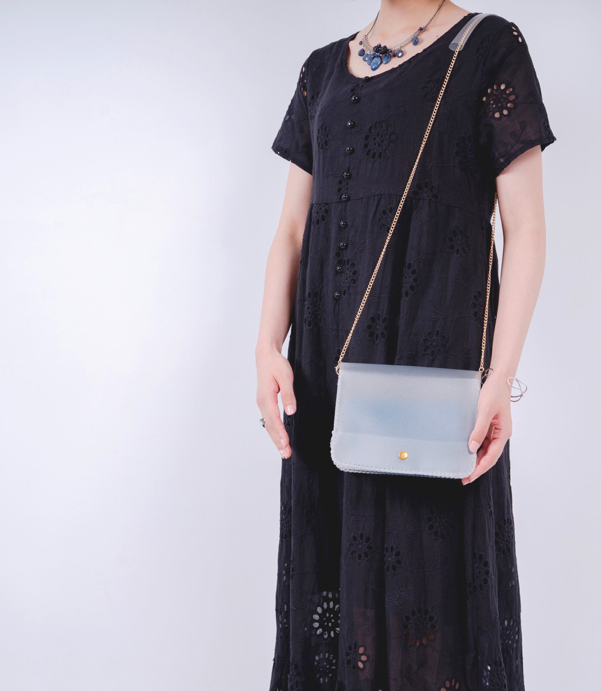 スナップだけの開口口で、荷物を出し入れしやすく、パパっと入れても半透明だから、外からは綺麗見え。装いにも抜け感を作ってくれます。
